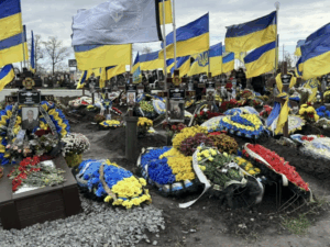 Thereafter we moved on to the vast city cemetery just outside town, where we counted 2,200 military graves in stunned silence. The trauma-worn faces of that morning’s elderly patients stood in stark contrast to the youthful photographs on the gravestones. Two thousand flags rippled in the low autumn light.